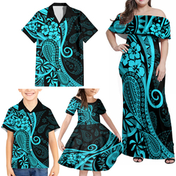2025 Logo personalizzato famiglia polinesiana abbinata a spalle scoperte Maxi abito e camicia festa dell'isola del Pacifico Set basso MOQ